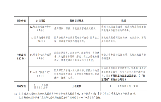 2022年度“对标定级”工作于12月集中开展,12月10日前完成。针对成立6个月以上(2022年6月1日前成立)的团支部。(流动团员团支部、临时团支部、待转接团支部等不纳入“对标定级”范围。)
