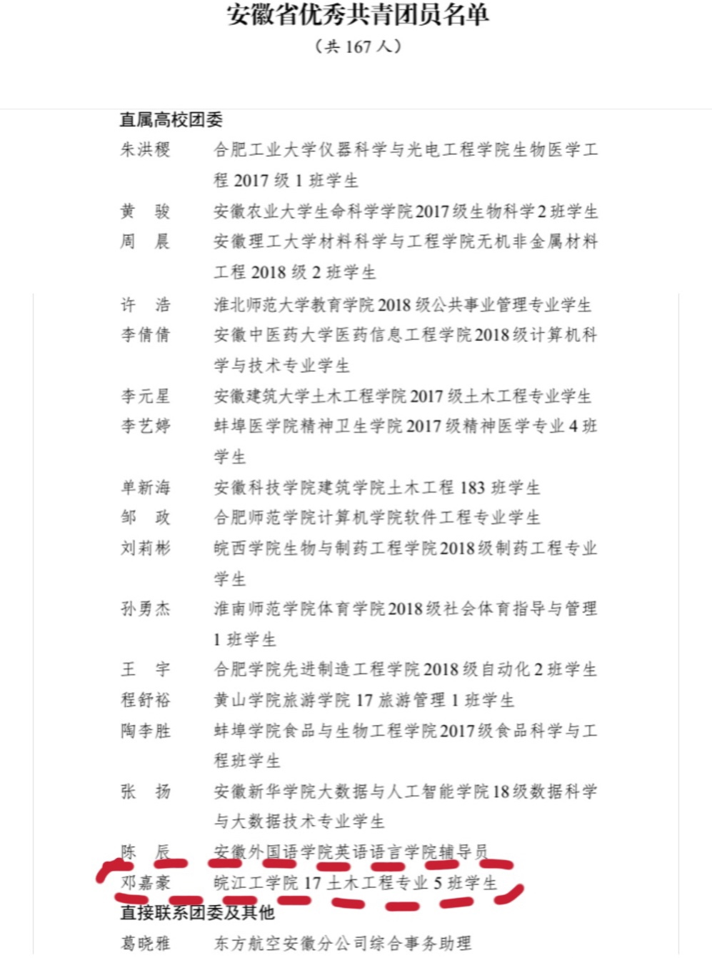 近日,共青团安徽省委公布表彰“安徽省优秀共青团员”“安徽省优秀共青团干部”“安徽省五四红旗团(总)支部”“安徽省五四红旗团(工)委”的,名单,我校17级土木工程专业邓嘉豪同学荣获安徽省优秀共青团员称号。