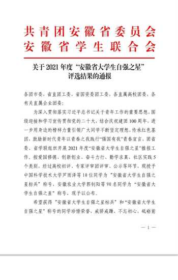 近日,由共青团安徽省委员会、安徽省学生联合会联合发布的《关于2021年度“安徽省大学生自强之星”评选结果的通报》文件中,我校水利工程学院2019级农业资源与环境专业的李永杰、机械工程学院2019级车辆工程专业的张飞龙获评2021年度“安徽省大学生自强之星——奋斗力行类别”荣誉称号。
