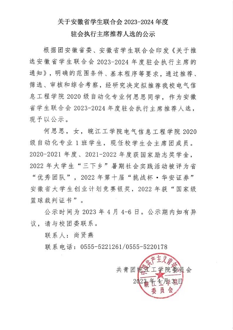 关于安徽省学生会联合2023-2024年度驻会执行推荐人选的公示