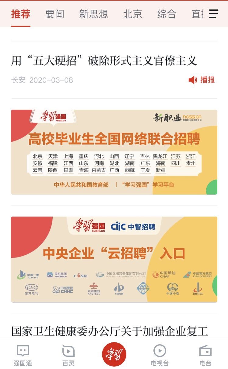 (1)在手机中下载“学习强国app”,在左上角的推荐栏目中找“高校毕业生全国网络联合招聘”,点击进入