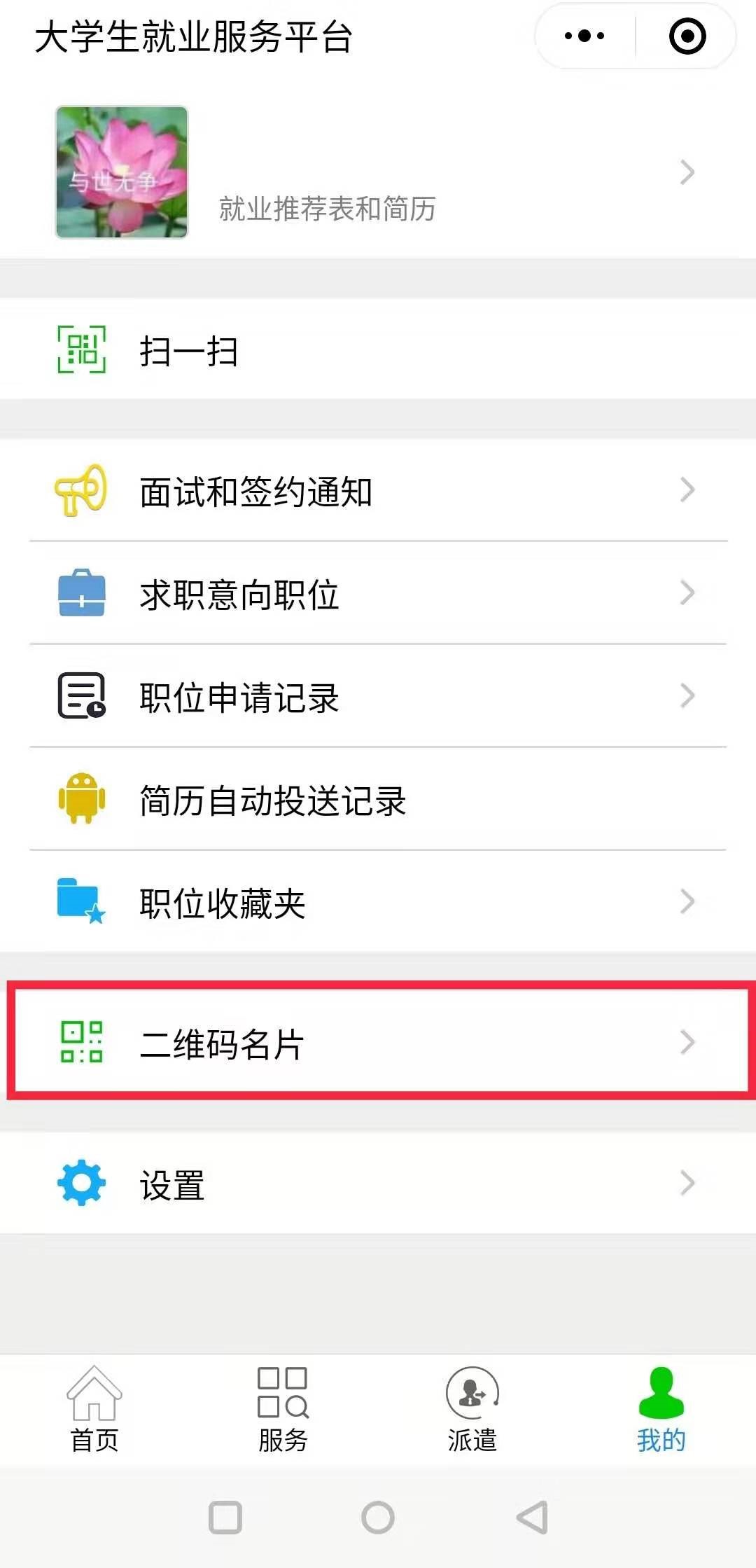 2、在“我的”中打开“二维码名片”,向用人单位发送二维码,并告知用人单位使用微信扫描“二维码名片”。
