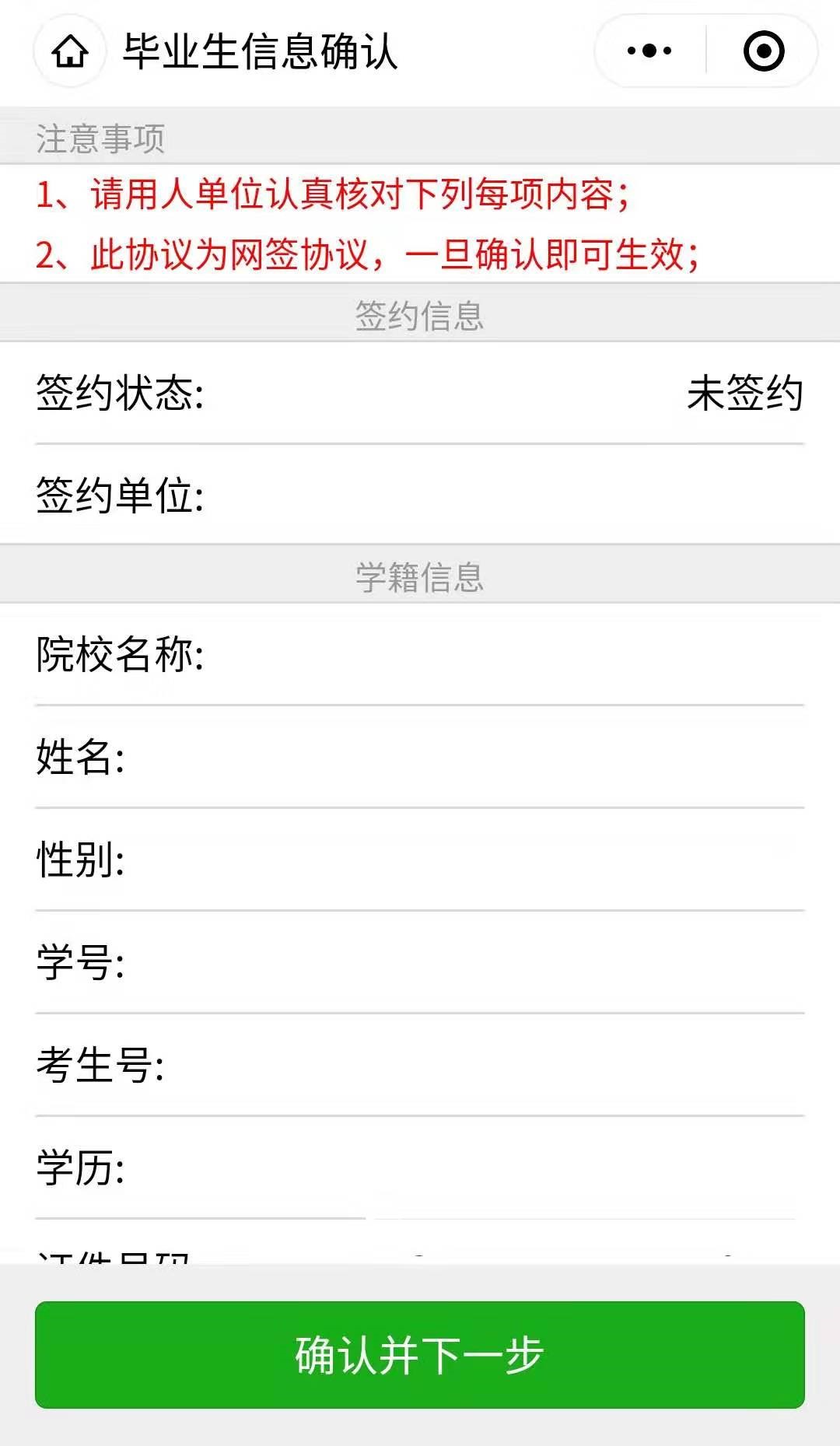 打开微信,使用扫一扫功能,扫描毕业生提供的二维码名片后,会出现填写签约信息页面;首先验证毕业生信息,确认下一步后,填写本单位基本信息和联系方式,并选择签约毕业生的工作岗位,然后点击“确认签约”后提交。