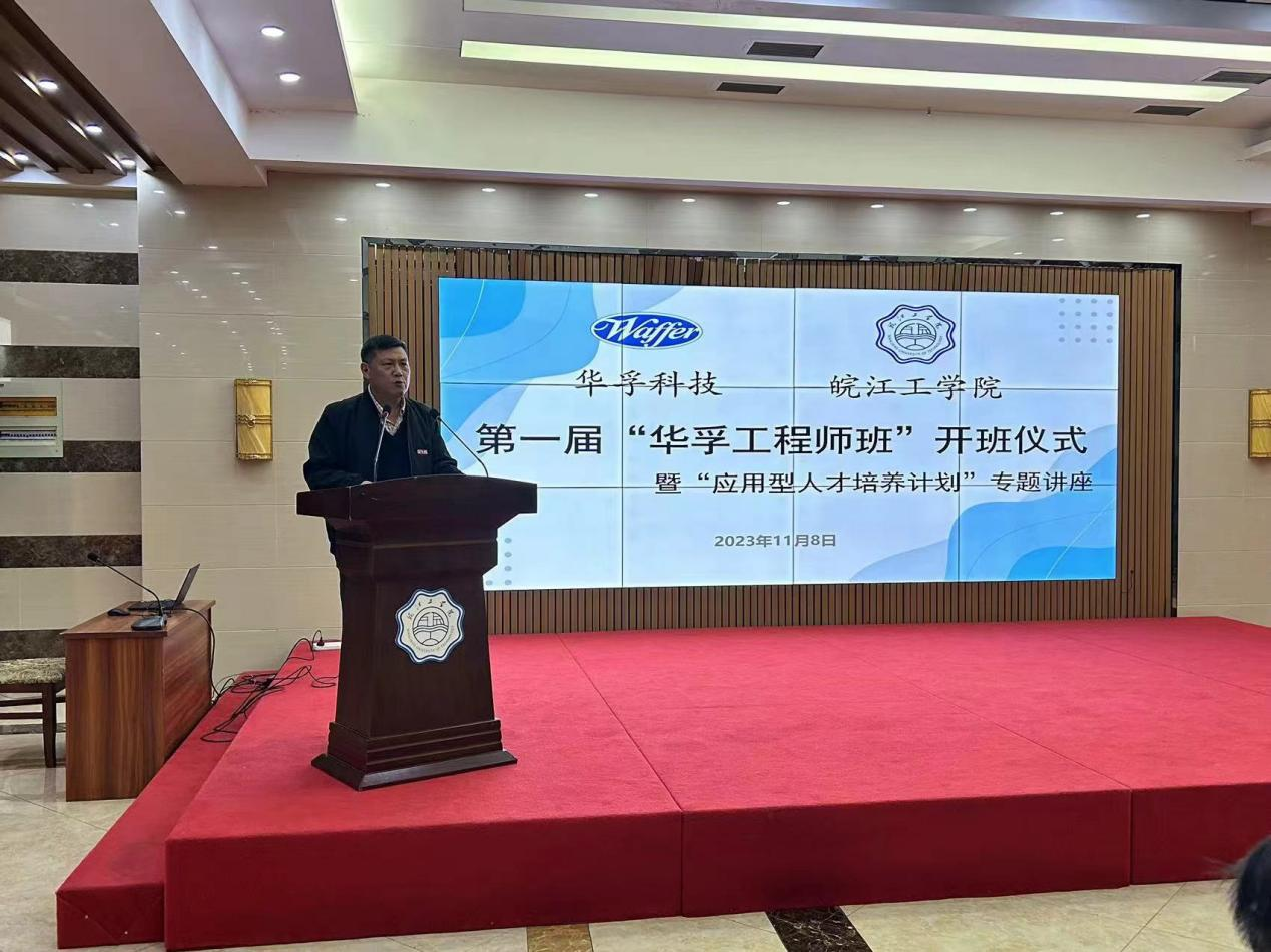 11月8日下午,我校举行了第一届“华孚工程师班”开班仪式暨“应用型人才培养计划”专题讲座,企业方代表华孚精密科技(马鞍山)有限公司副总经理丁有安、制造中心总监李文念、设备及自动化中心总监祝超杰等人与校方代表皖江工学院校长吴继敏、副校长侯进元、工程师学院院长汪光阳、副院长刘国高、院务部部长沈筱华、教务部部长江冰、机械工程学院院长朱天宇等人参加了开班仪式,仪式由皖江工学院副校长侯进元主持。