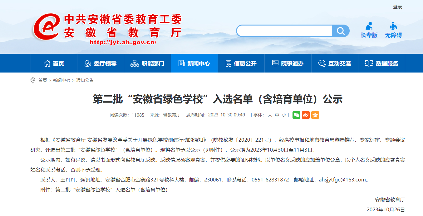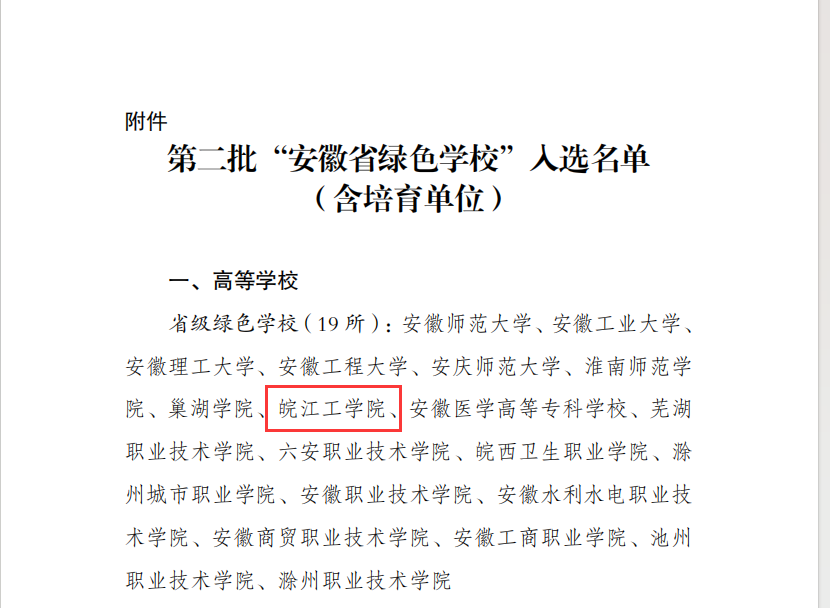 近期,根据安徽省教育厅官网公示,我校成功入选为第二批省级绿色学校。2020年12月24日,省教育厅发改委发文开展全省绿色学校创建活动,创建指标包括精神文化、物资条件、行为管理、特色创新四大类。我校积极响应号召,成为第一家全省省级民办本科绿色学校。