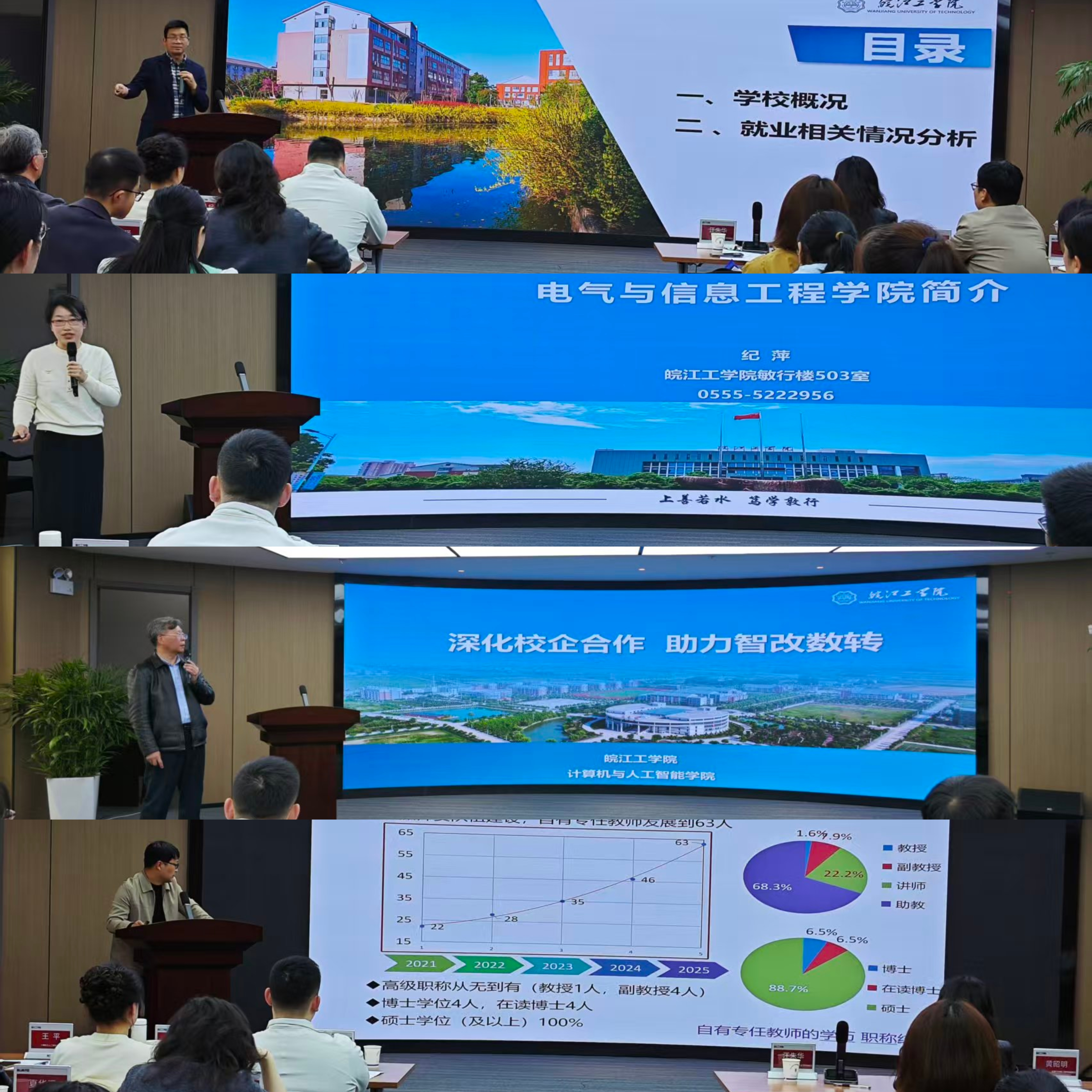 会上,皖江工学院学生处常务副处长汪朱华向与会嘉宾全面介绍了学校的发展历程、办学规模、学科优势与人才培养特色。学校电气与信息工程学院、计算机与人工智能学院、机械与车辆工程学院的负责人分别详细解读了各学院的专业设置、师资力量、科研成果,并重点推介了面向企业需求的校企合作模式与订单班培养方案,展现了学院在应用型、技术技能型人才培育上的实力与方向。