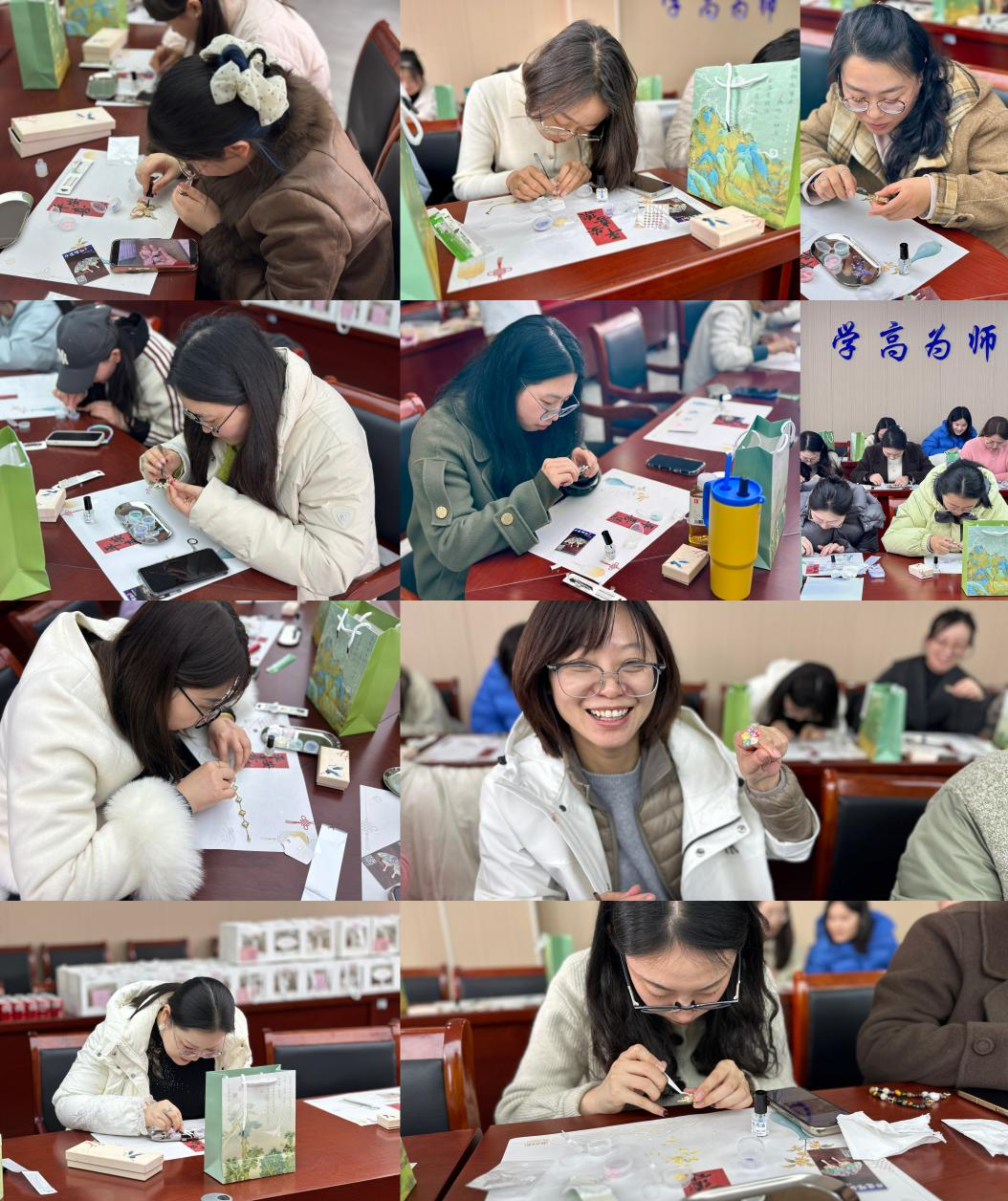 在非遗螺钿制作体验环节,女教职工们亲手尝试制作螺钿工艺品。活动现场提供了齐全的材料工具和详细的操作说明,大家兴致勃勃,细心雕琢,将土木工程中的“精准施工”“结构安全”理念与传统工艺中的“匠心精神”巧妙融合,创作出一件件独具匠心的作品。作品展示环节,大家纷纷亮出自己的成果,交流创作心得,现场洋溢着成就与喜悦。