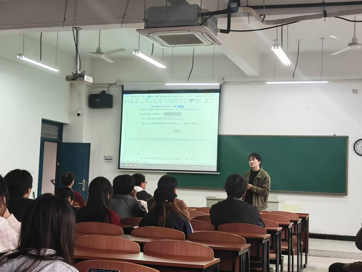 随后,常竹围绕《皖江工学院工程师学院专业技术资格评审标准条件(试行)》文件,为同学们开展全面系统的政策解读。他清晰梳理了技术员、助理工程师、工程师三个层级的申报核心条件,重点拆解了工程师资格评审的七项关键标准,逐一说明毕业设计成绩、学科竞赛获奖、专利成果、大学生创新创业训练计划项目、职业技能等级证书、国家计算机等级考试及学术论文发表等具体要求,让同学们清晰掌握评审细则、明确努力方向。
