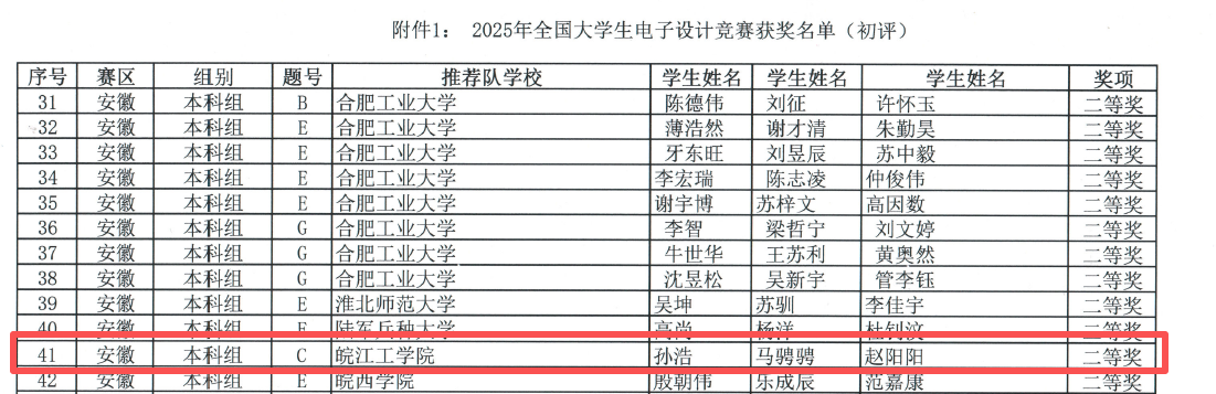 全国大学生电子设计竞赛作为工科教育改革的重要抓手,始终致力于推动电子信息技术与新质生产力的深度融合。此次获奖,既是对皖江工学院"以赛促教、以赛促学"实践教学模式的肯定,也是创新与产业工程师学院和电信工程学院"赛训融合、科创育人"教学改革成效的生动体现。未来,皖江工学院将持续深化教学改革,强化实践育人平台建设,为培养更多新时代科技工匠贡献力量。(电信工程学院和创新与产业工程师学院联合供稿)