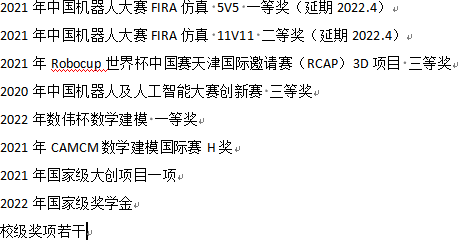 2022 年的中国机器大赛中,FIRA11v11 和北理、地质等强队角逐下以小组赛第二出线,在淘汰赛中,不敌上届冠军西北工业大学,遗憾止步第八。2021 年Robocuo 世界杯 3D 项目中,面对去年的严峻情况,我们顶住压力,在实验室指导老师和项目成员的努力下,项目成功推进,比赛名次获得提高。