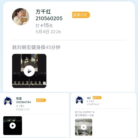活动期间,同学们采用线上打卡方式,将自己每天运动的照片、视频等打卡记录上传至运动打卡群。连续打卡七天、十四天者可分别参与一次抽奖,获得大学生心理委员会精心准备的丰厚奖品。活动开始后同学们都十分积极地在群内晒自己的运动记录,活动取得圆满实效。