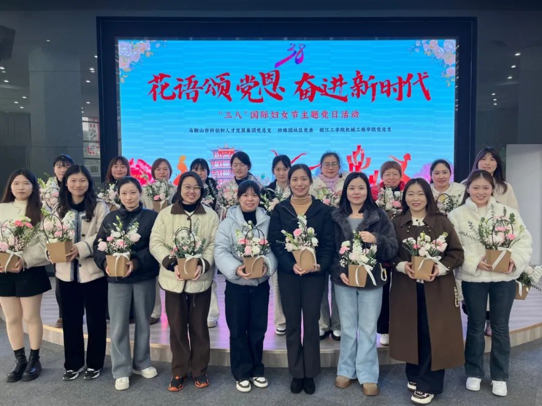 3月6日,在第115个“三八”国际妇女节到来之际,市科创和人才发展集团联合珍珠园社区、皖江工学院在市青年创新创业园开展“花语颂党恩 奋进新时代”主题党日活动。市科创和人才发展集团、珍珠园社区、皖江工学院机械工程学院女性党员、职工20余人参与。