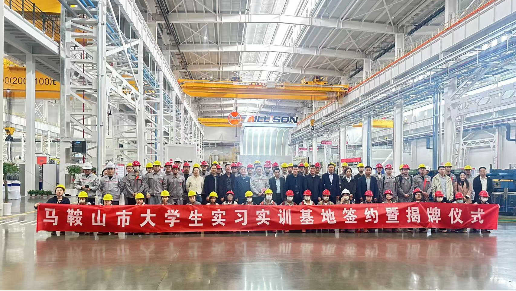 2024年11月13日上午,机械工程学院在安徽美利信智能科技有限公司生产车间隆重举行马鞍山市大学生实习实训基地签约暨揭牌仪式活动。出席本次活动的有马鞍山市委人才工作局副局长丁镠、江东控股集团党委副书记张永东、博望区委常委、组织部部长李海龙、宁马省际毗邻地区新型功能区管委会副主任严军、安徽美利信智能科技有限公司总经理佘涛、皖江工学院机械工程学院院长朱天宇、机械工程学院副院长吴云鹏、以及机械工程学院教师代表、21级能源与动力工程专业学生。