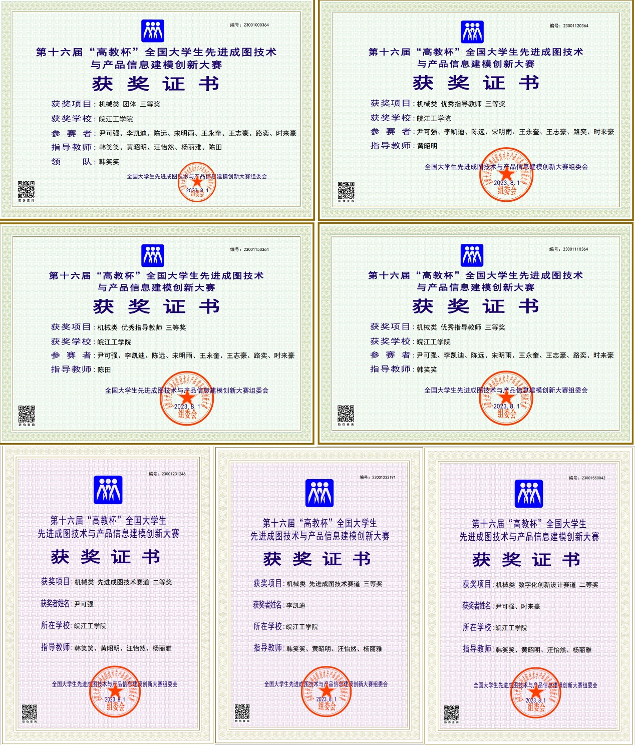 本次比赛在学校教务部和机械工程学院的大力支持下,历经校赛、省赛和国赛,指导老师和学生团结一心,共同努力,密切合作,成绩再创新高。机械工程学院共斩获机械类团体三等奖1项,机械类先进成图技术赛道个人二等奖1项,机械类先进成图技术赛道个人三等奖1项以及机械类数字化创新设计赛道团体奖二等奖1项。