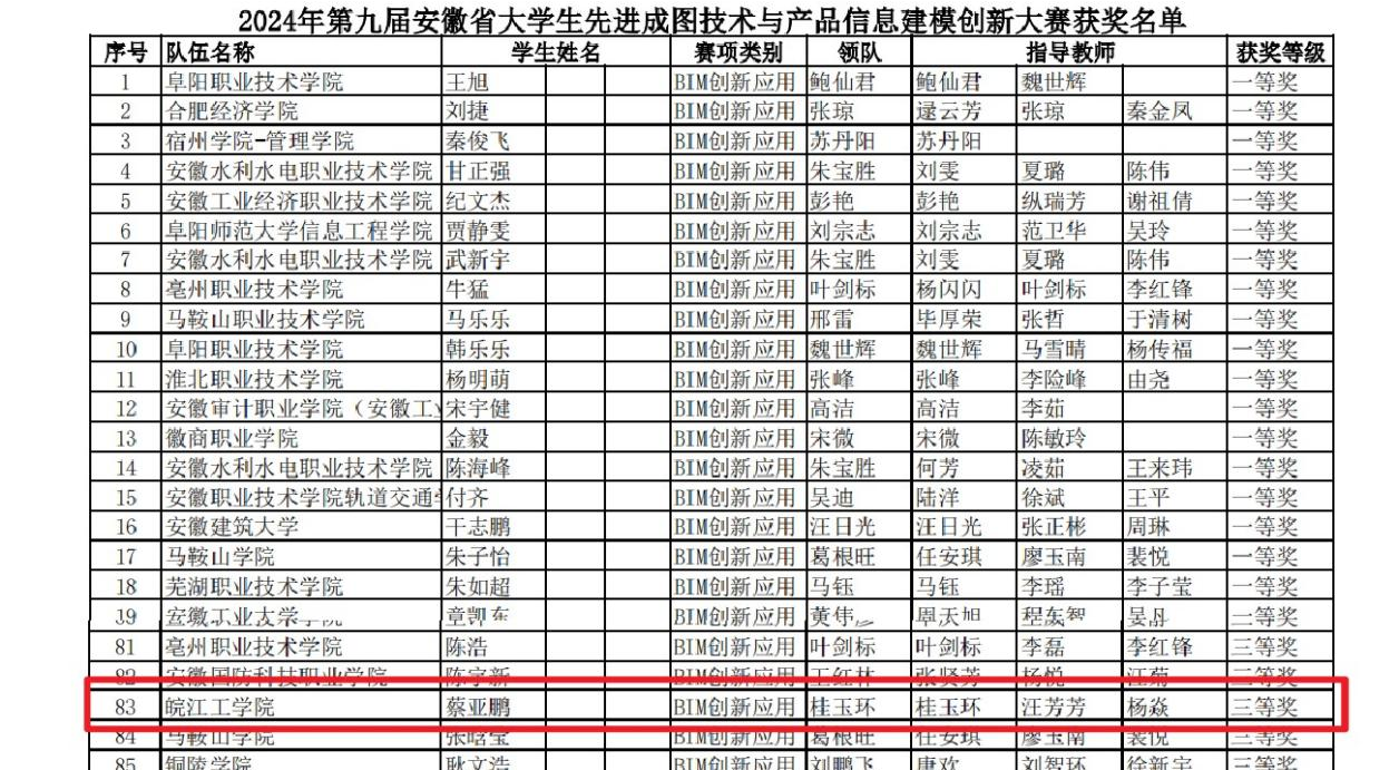 2024年6月08日比赛成果公布,我院由桂玉环、杨焱、汪芳芳教师指导的一支队伍在此次省赛中荣获三等奖。成图大赛由安徽省教育厅主办,并由合肥工业大学承办,安徽省图学学会协办,因此赛事级别属于B类赛事,每年都有一千多支队伍赶到现场参加省赛,在此次BIM创新应用赛道学生们能够脱颖而出荣获三等奖,已实属不易。管院指导教师们必将再接再励,争取在下一届带队参赛的同学们中带出更好的成绩!
