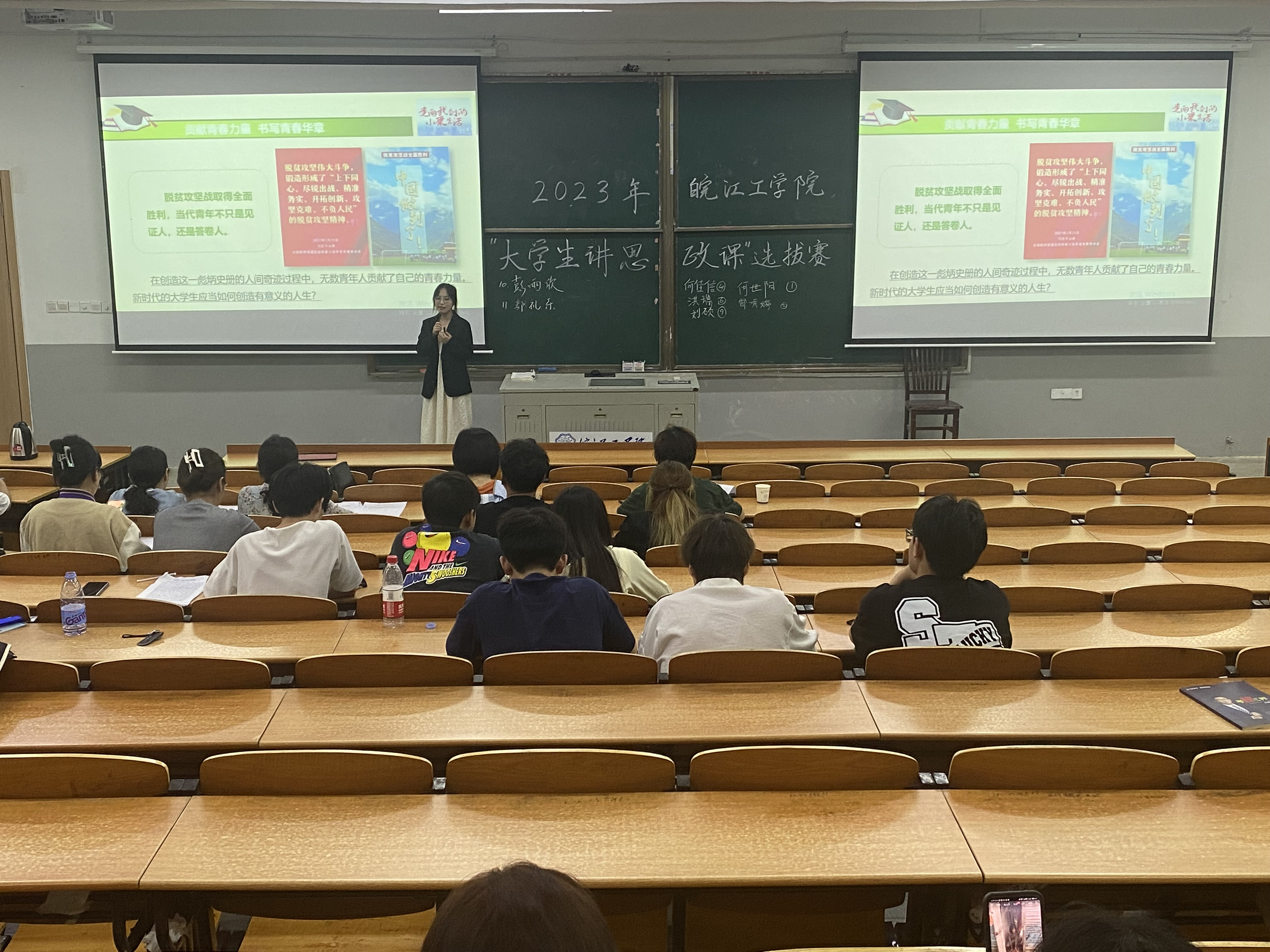 为落实立德树人的根本任务,培养大学生对思政课的独立思考和深刻见解。6月18日,皖江工学院马克思主义学院在B108教室举行“大学生讲思政课”活动的决赛。马克思主义学院常务副院长刘双、院长助理张春艳、德法与马原教研室主任赵萍、概论与形策教研室主任杨锴作为此次活动评委,全体比赛活动的团队小组参加活动。
