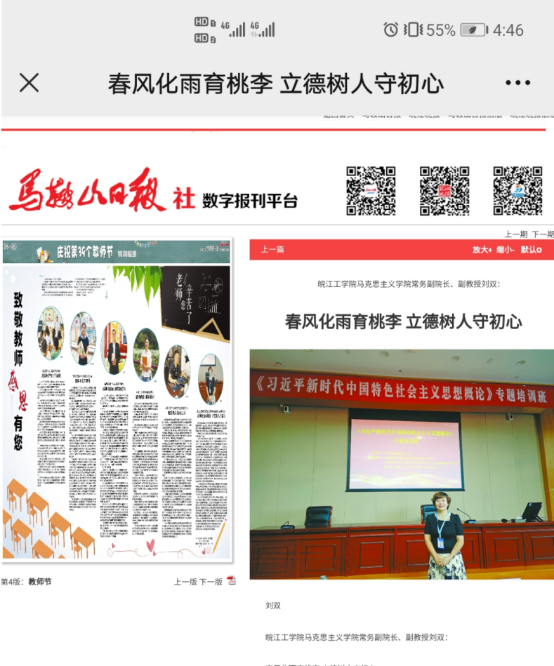 2023年9月7日,马克思主义学院常务副院长刘双接受马鞍山日报记者采访,讲述坚守立德树人初心,秉持实践育人理念的教学心路历程。