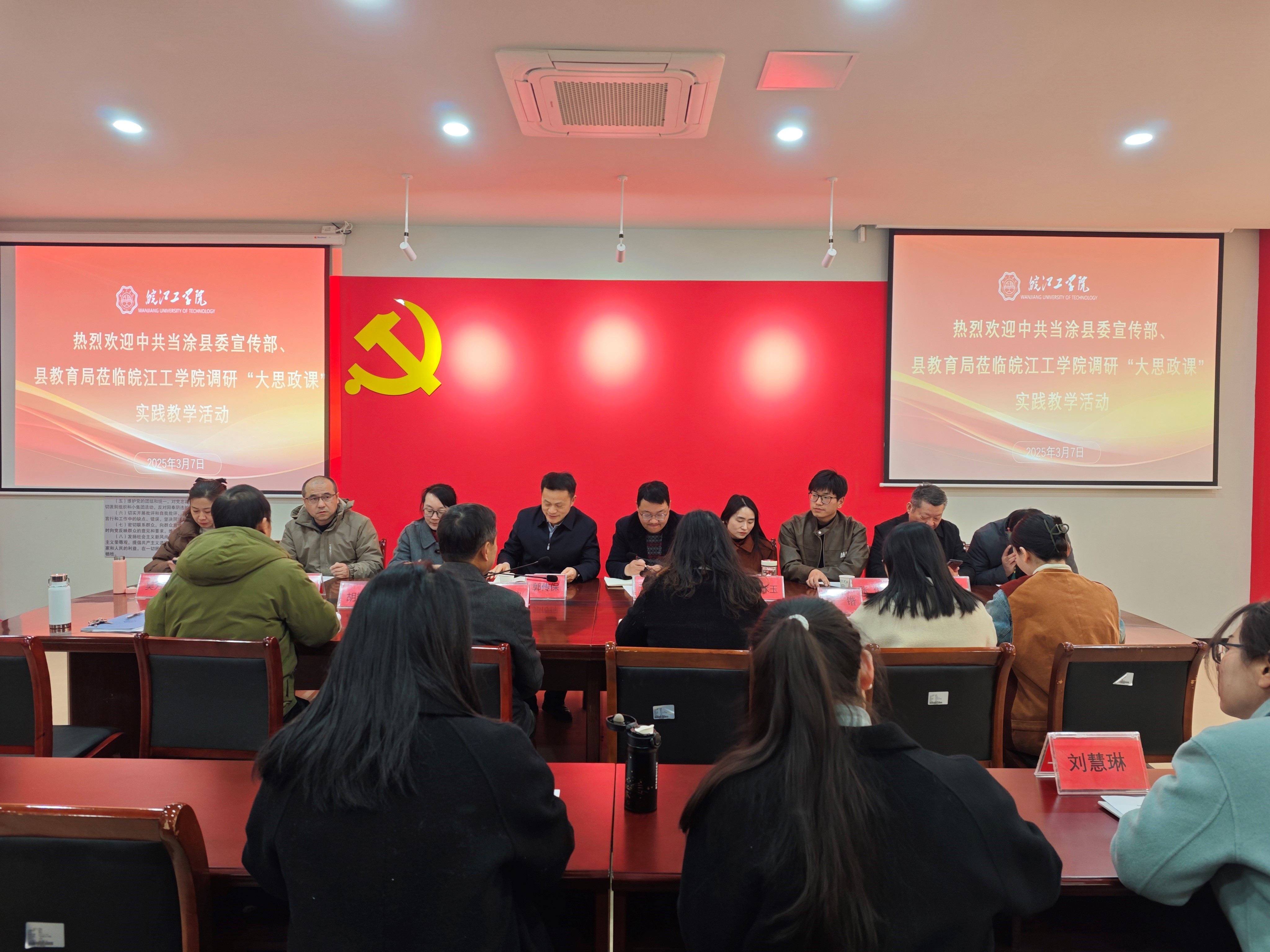 3月7日下午,中共当涂县委宣传部、当涂县教育局、当涂县大中小学校、当涂县千字文书院等单位来我校马克思主义学院调研“大思政课”实践教学活动。调研会议在笃学楼西马克思主义学院405会议室举行。中共当涂县委常委、宣传部部长郭传保,宣传部副部长王平,县委宣传部理论室(意识形态室)负责人王沅霞,县教育局总督学宁冰玉,德育办(青少年活动中心)副主任谷俊,马鞍山学院马克思主义学院思政教师张俊,当涂县实验学校校长吴芳龄,当涂一中党委委员、党务办主任兼县中学政治教研员邰纯兵,千字文书院院长冯金城等参加调研。我校党委副书记、副校长孙良,马克思主义学院党总支书记、常务副院长刘双,副院长胡耀东,各教研室主任和马鞍山市“大思政课”实践教学研究中心秘书组全体人员出席会议,会议由孙良主持。