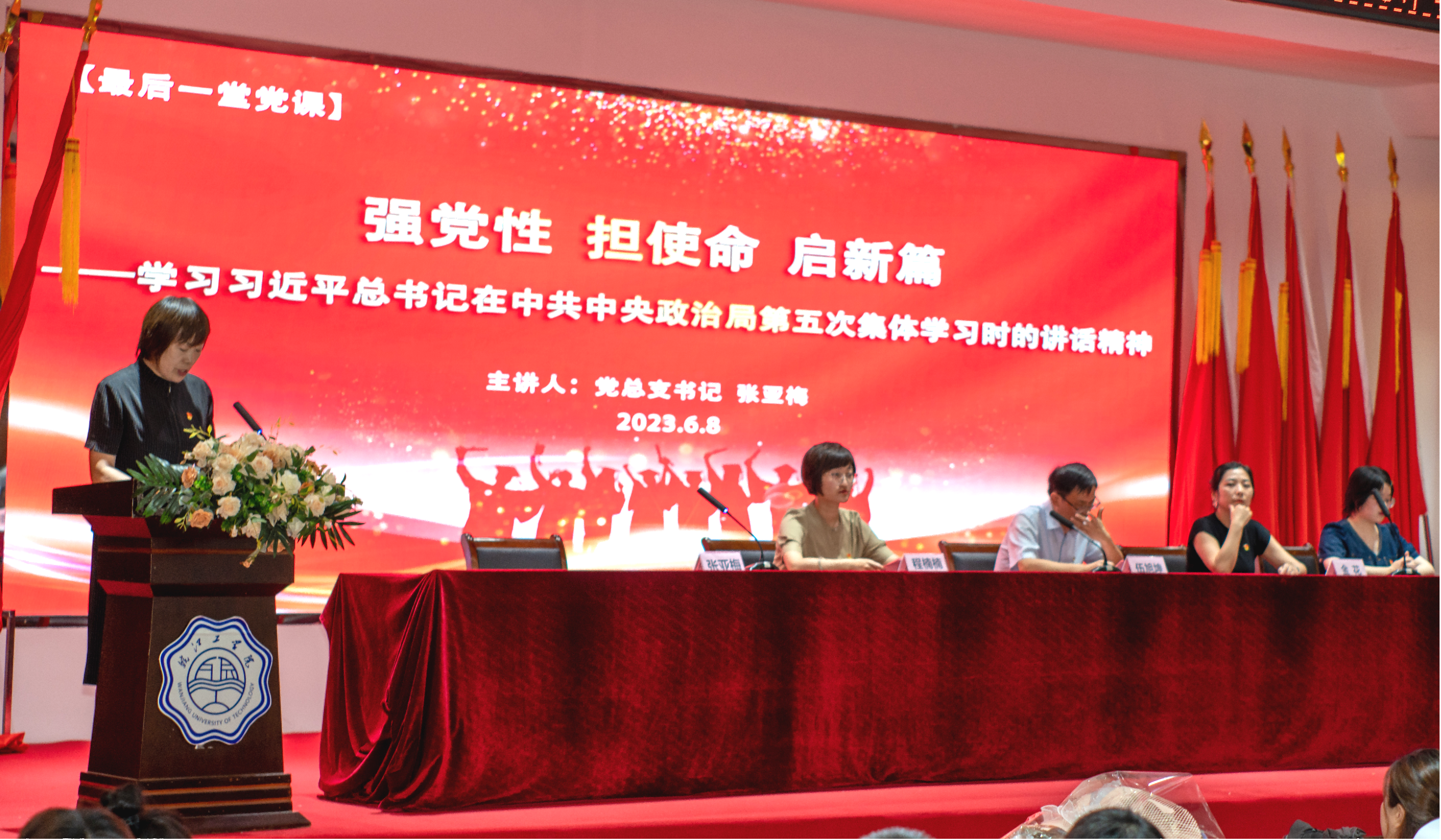 党总支书记张亚梅为毕业生党员主讲《强信念 担使命 启新篇——学习习近平总书记在中共中央政治局第五次集体学习时的讲话精神》最后一堂党课。张书记用九句话着重阐述了习近平总书记报告主题思想,教育引导广大毕业生党员要不断加强政治理论修养,进一步坚定理想信念,为早日实现教育强国目标而共同努力。同时,张书记对全体党员师生提出四点期望与要求:一要树立终身学习理念,不断增强党性修养;二要进一步提高专业素养,锤炼扎实过硬本领;三要立足岗位践行宗旨,不辱使命奋发有为;四要具有世界眼光,民族精神,在实现中华民族伟大复兴、推进人类文明进步中谱写人生美好篇章。