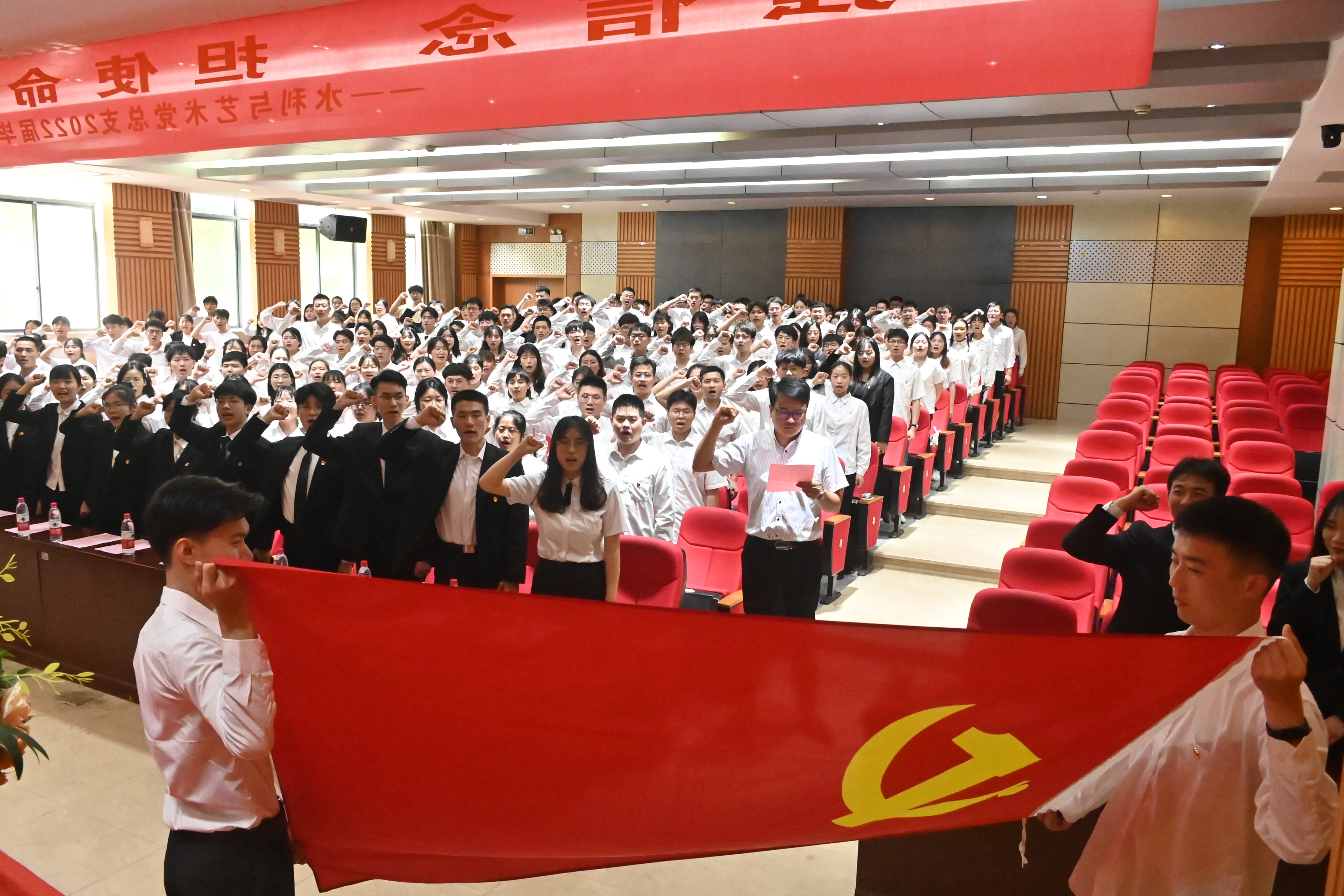 党总支组织委员、学生二支部书记班兵带领全体党员面向党旗重温了入党誓词。铿锵有力的誓言,字字发自心底。这是我们水利人和艺设人初心使命的宣示,这是我们水利人与艺设人接续奋斗的再出发。