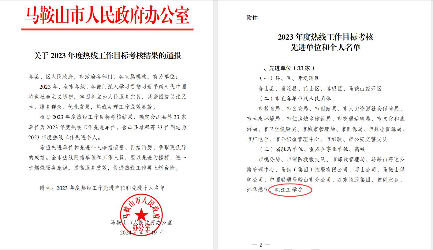 4月19日,获马鞍山市政府通知,我校在2023年度热线工作目标考核中表现出色,荣获市“2023年度热线工作先进单位”荣誉称号,王筱晗同志荣获“先进个人”称号。
