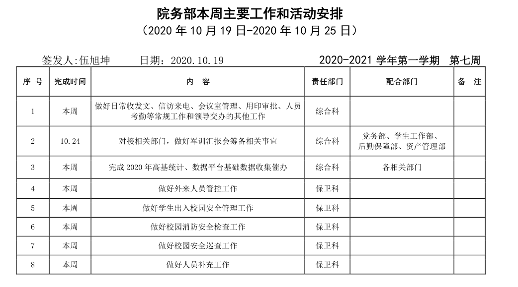 皖江工学院院务部第七周工作安排