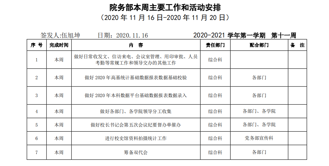 皖江工学院院务部第十一周工作安排