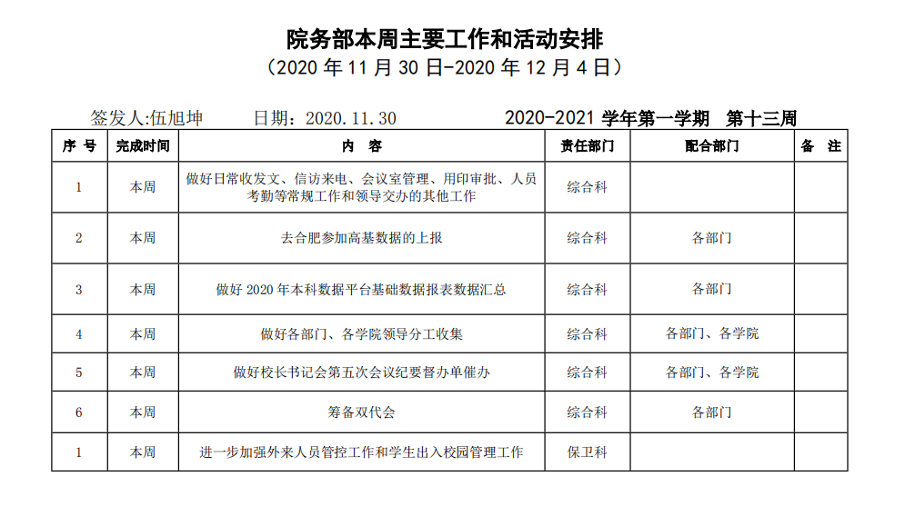皖江工学院院务部第十三周工作安排