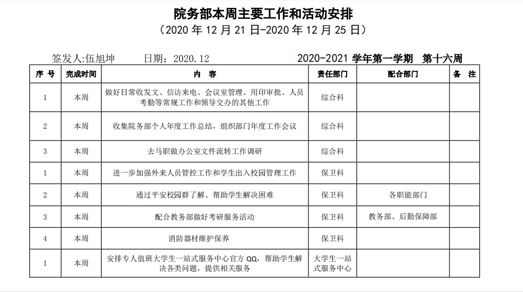 皖江工学院院务部第十六周工作安排