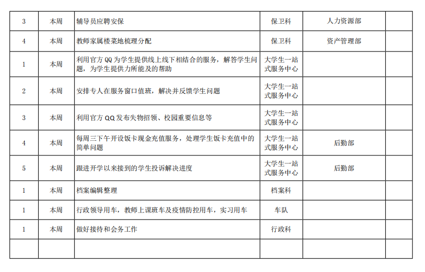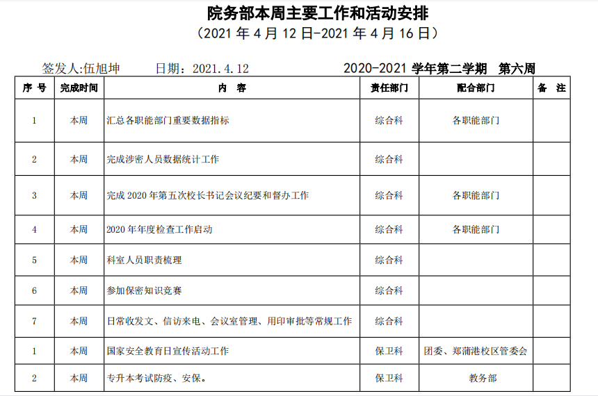 皖江工学院院务部第六周工作安排