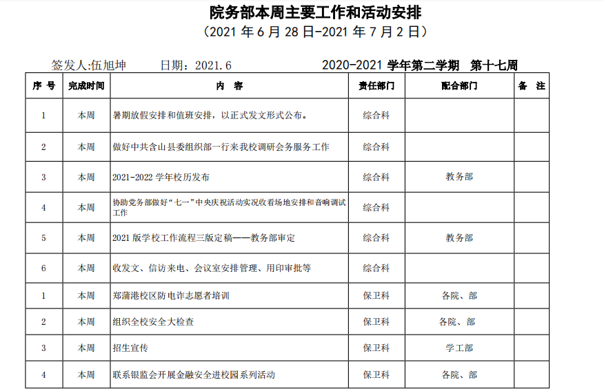 皖江工学院院务部第十七周工作安排