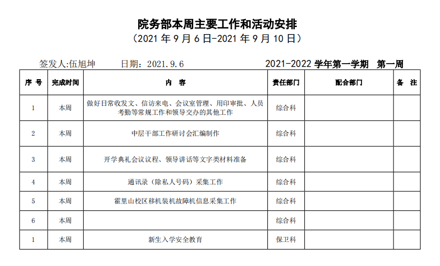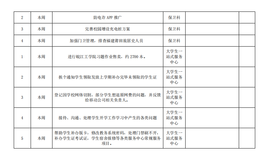 皖江工学院院务部第一周工作安排