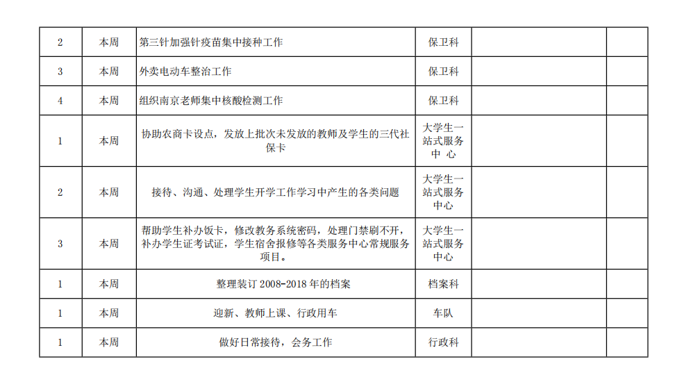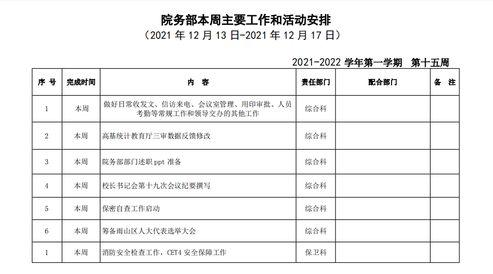 皖江工学院院务部第一周工作安排