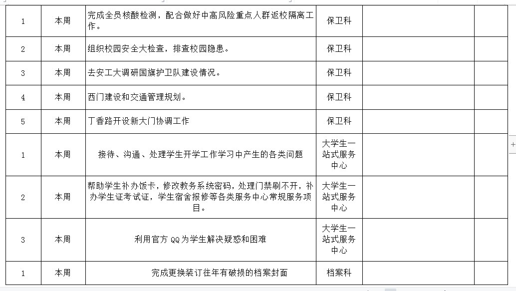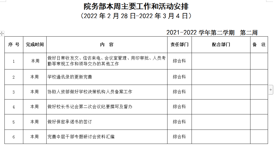 院务部第二周工作安排