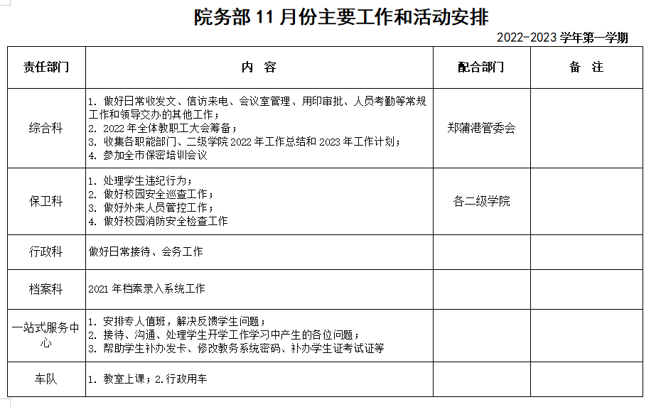 院务部十一月份工作安排