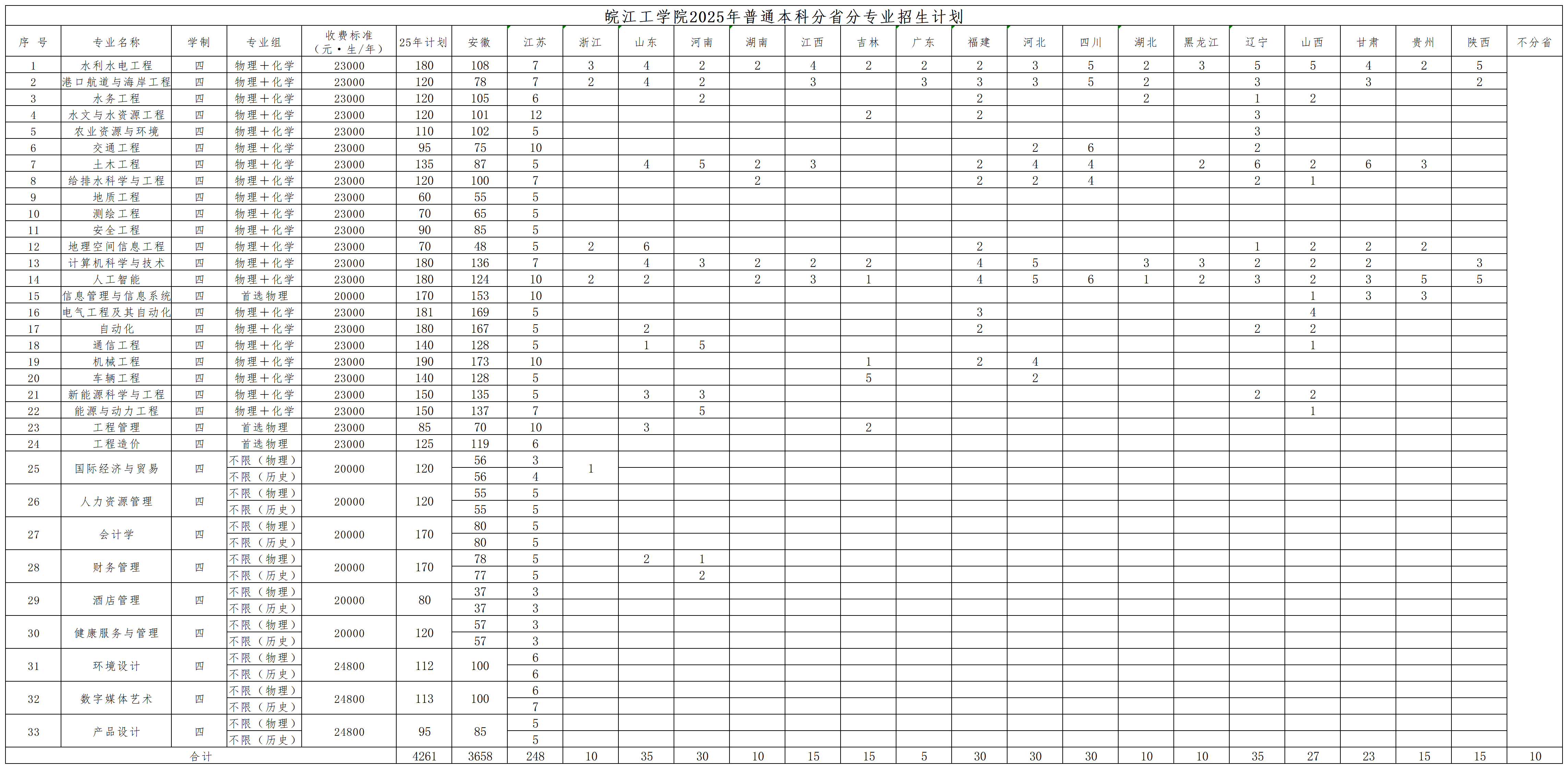 答:我校2025年招生计划4261个,其中安徽省招生计划3658个,外省招生计划593个,不分省招生计划10个。招生专业包括水利水电工程、水文与水资源工程、港口航道与海岸工程、水务工程、农业资源与环境、土木工程、给排水科学与工程、测绘工程、地质工程、交通工程、安全工程、地理空间信息系统、电气工程及其自动化、通信工程、自动化、计算机科学与技术、人工智能、机械工程、车辆工程、能源与动力工程、新能源科学与工程、国际经济与贸易、会计学、财务管理、信息管理与信息系统、工程管理、工程造价、人力资源管理、健康服务与管理、酒店管理、环境设计、数字媒体艺术、产品设计在内的33个。
