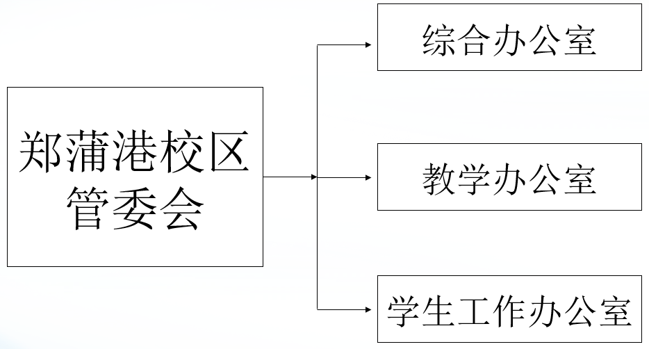 郑蒲港校区设立郑蒲港校区管理委员会(简称“管委会”),下设综合办公室、教学办公室、学生工作办公室,具体负责郑蒲港校区的相关管理工作,接受学校职能部门的业务指导,具体工作职责如下: